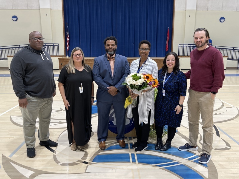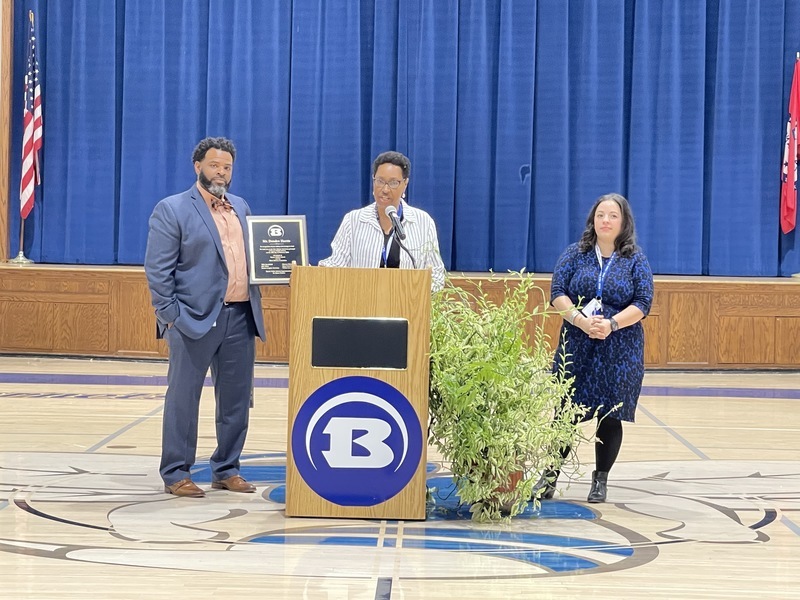Amelia Lisowe provided the history of Black educators at Bryant Middle School, celebrating Mrs. Wilma Lee, the first African American teacher in the Bryant School District. Mrs. Lee began her career at Bryant in 1991. Thirty-two years later she continues to serve as a role model for students, staff and the community. Mrs. Lee was presented with a floral arrangement from her family who joined the school in the celebration.