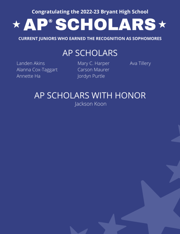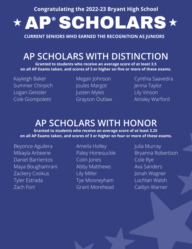 College Board recently announced the 2023 AP Scholar recipients for Bryant High School based on performance on this year’s AP exams. A total of 179 AP Scholar Awards at all levels have been granted to students at Bryant. These students had an average score of 3.27.