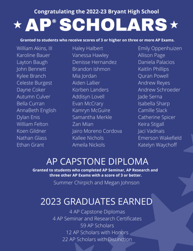 During May 2023, students at Bryant High School took Advanced Placement exams which tested the content knowledge and skills gained in each of their AP courses. Each qualifying score of 3, 4, or 5 equates to earned college credit, tuition savings, and proof of a student’s ability to handle college-level coursework.