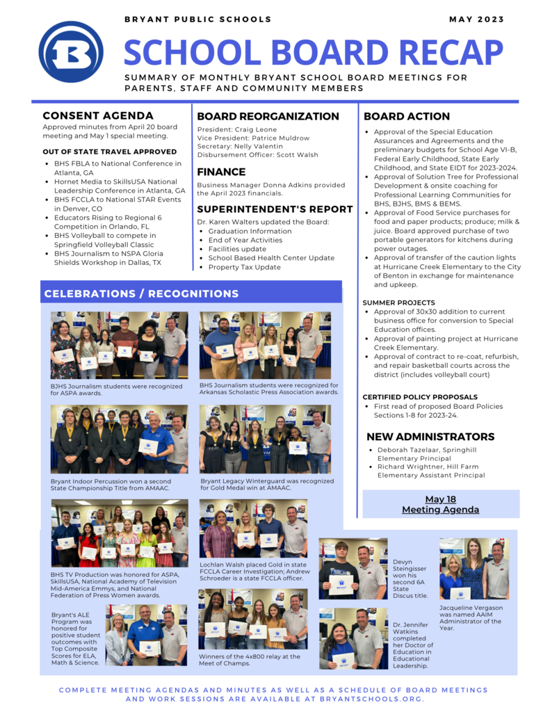 The Bryant School Board meets monthly. Following each regular meeting, Bryant Public Schools will publish a School Board Recap. We hope this short summary will provide parents and community members with user-friendly information about decisions being made at school board meetings. Links to the January 2024 meeting recap: