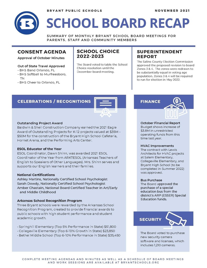 The Bryant School Board meets monthly. Following each regular meeting, Bryant Public Schools will post a School Board Recap. We hope this short summary will provide our families and community members with user-friendly information about decisions being made at school board meetings. See below for links to the the January 2022 meeting recap: